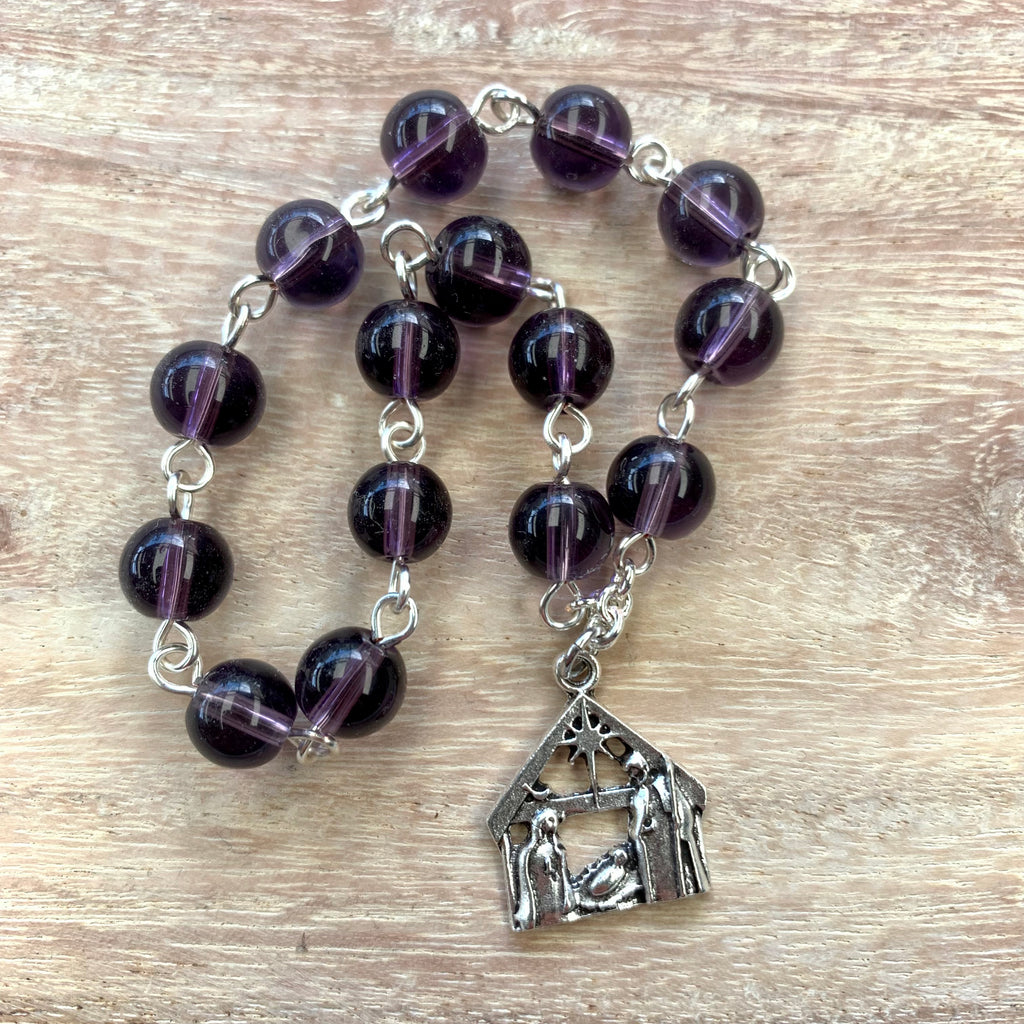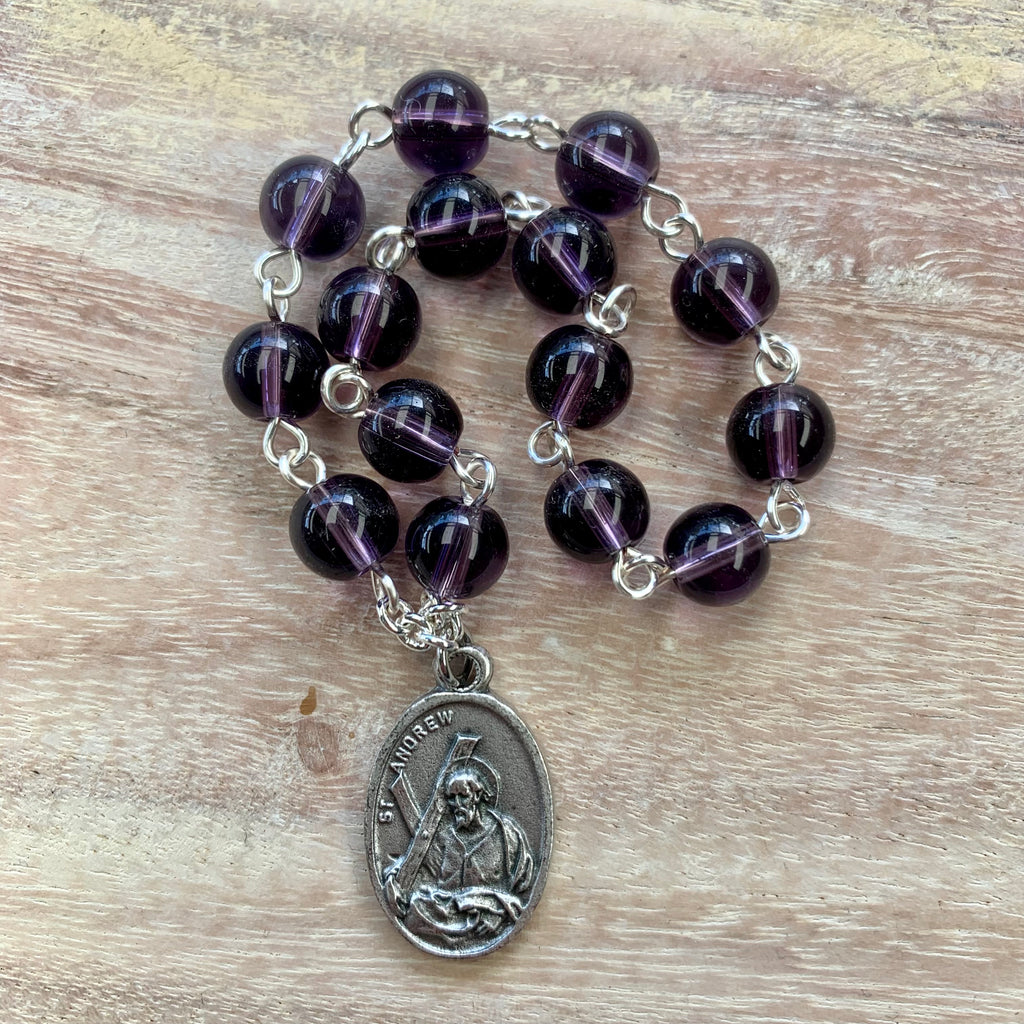 This Christmas Novena chaplet is made with 8mm purple amethyst glass beads, and features either a medal of the Nativity, St Andrew or the Holy Family.