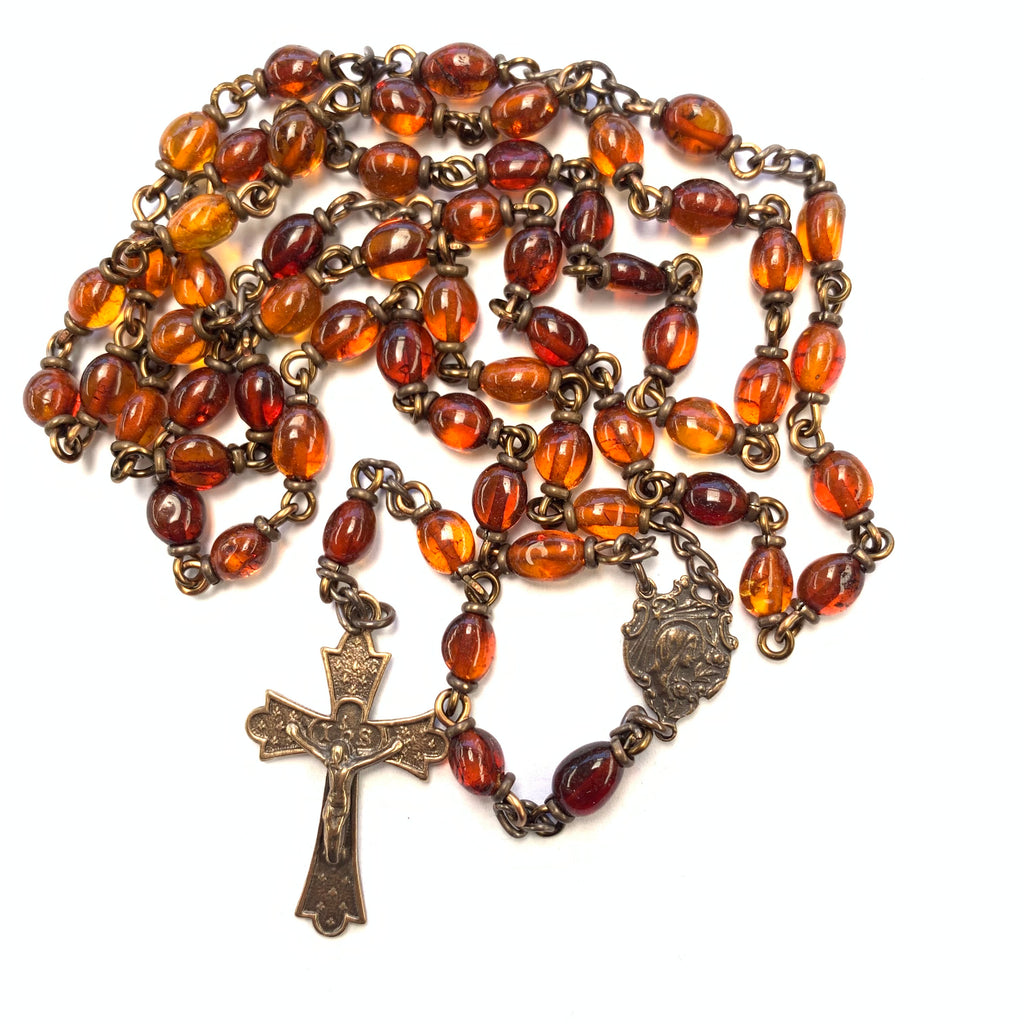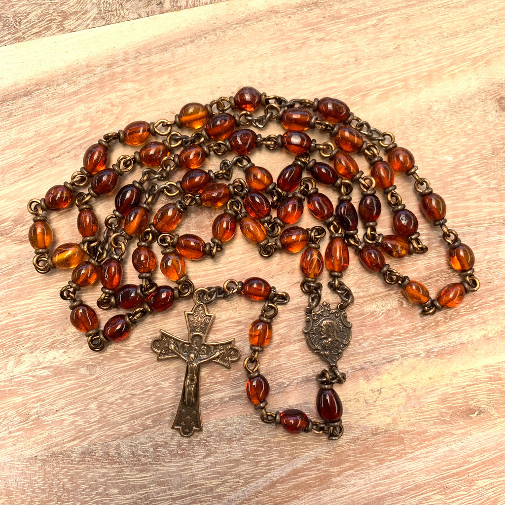 This beautiful Heirloom Rosary has been made with natural baltic amber beads measuring roughly 8x6mm. The centre features Mary on one side and Jesus on the other, and it is finished with a Fleur-de-lis crucifix. Each link has been hand turned with 18 gauge wire, ensuring strength and durability, as well as beauty.